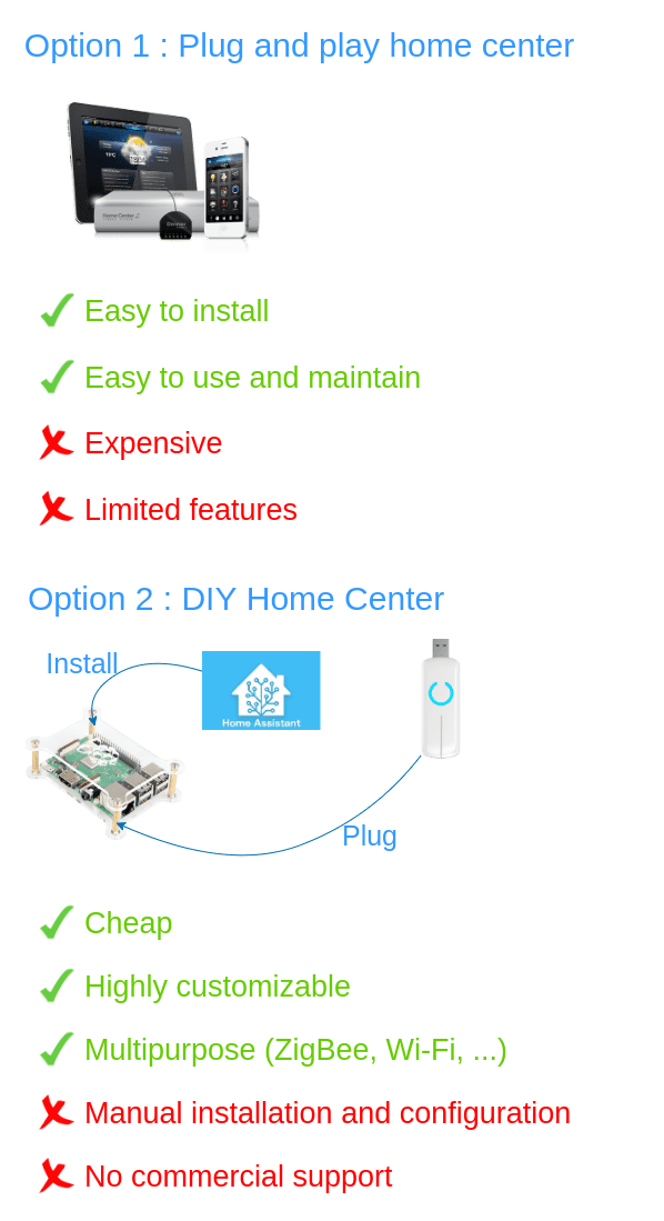 The home centers are usually tied to a specific brand, for example there is the Fibaro home center. The advantage of these hubs is that almost everything is pre-set up for you: once you have plugged your hub, you can manage new Z-Wave devices and create automation scenarios very easily. The disadvantage is that you will most likely be limited in terms of available features. In summary the home center combines the hardware capable of talking with Z-Wave devices and the software allowing you to automate, control and monitor the devices.